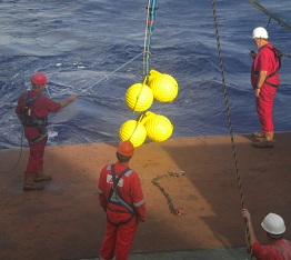 After the CTD probe, we moved the ship to collect the mooring that we put down on the seafloor on April 4th. It was a relief when the sound signals from the ship successfully triggered the mooring's release mechanism, and its orange and yellow floats started to bring it back to the surface. The deck crew handled the challenge of getting the mooring back aboard, led by Chief Petty Officer (Deck) Tiny, co-ordinating with 3rd Officer Nick on the Bridge. Nick manoeuvered the ship carefully towards the floats, avoiding tangling the mooring line in the ship's propellers.