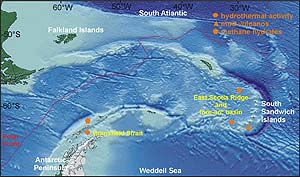 Life at vents around Antarctica could be related to that known in the Pacific, thanks to deep-water currents that run from west to east through the Drake Passage between Antarctica and South America. Alternatively, life at vents around Antarctica could be related that found on the Mid-Atlantic Ridge via 'stepping stones' that existed in the geological past.
