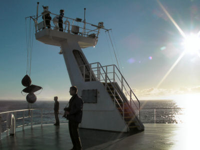 We cleared the entrance of the Straits of Magellan in the early hours this morning, and have spent the day heading south along the coast of Tierra del Fuego, with its mountains just visible off to starboard. This morning we were joined by dolphins, and in the afternoon our first albatross. After a grey cloudy start, we have enjoyed sunshine and gentle glassy swells this afternoon.