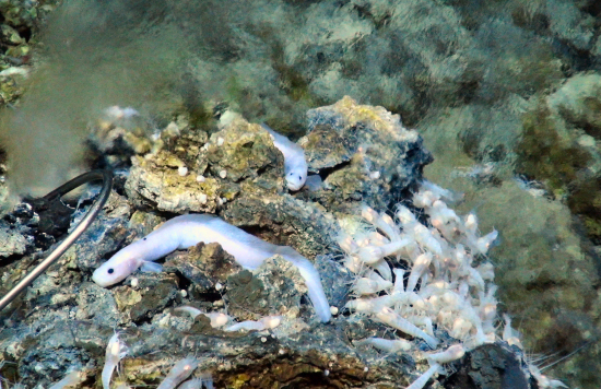 As our time remaing on the seafloor for this dive ticks down, we are collecting specimens of the other deep-sea creatures here, to understand what they eat, how they reproduce, and how they are related to species elsewhere. My favourites from the dive so far are the zoarcid fish, which seem to bask on the rocks just around the vents.
