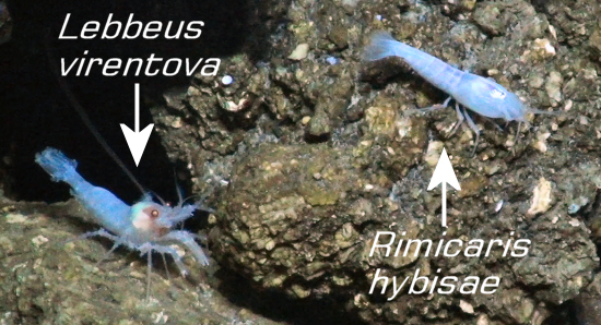 These abundant shrimp are Rimicaris hybisae. They belong to the genus Rimicaris because they are related to shrimp found at vents in the Atlantic and Indian Oceans, and Verity named this new species hybisae in honour of the vehicle which which we saw and sampled the vents for the first time during Voyage 44 of the RRS James Cook.